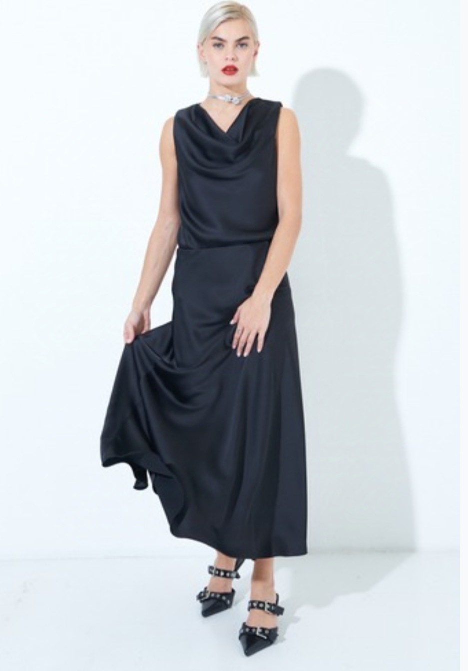 Gonna lunga svasata in raso di viscosa, con elastico in vita.